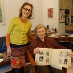 גב׳ ראומה ויצמן מחזיקה את האלבום ועל ידה זהבה מוסקוביץ הילדה גולדי מפעם