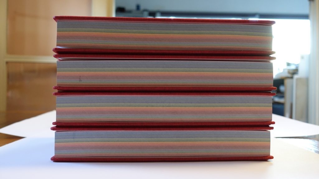 העיצוב הראשוני היה עם גרפיקאית נהדרת שעבדה איתי על הספר מתחילתו, אך בתום שנת עבודה, נסעה לחו״ל עם one way ticket, וכך נשארתי עם קובץ שצריך לעבור לגרפיקאית חדשה שלא מכירה את הפרויקט. מָעבר כזה בדרך כלל בין 2 צורות עבודה שונות ו-2 מחשבים שונים גורם לנפילות, בלבול ופחדתי שצריך יהיה לעצב דברים מחדש. למזלי, הרוב עבר טוב! המשכנו לעבוד והגיע הרגע להדפיס ולכרוך. בבית הדפוס הכנתי נייר מיוחד מתוצרת גרמנית: מונקן במשקל 90 גרם כדי שלא יהיה כבד מידי. ההדפסה עברה נפלא ועבודת הכריכה החֶלה.
