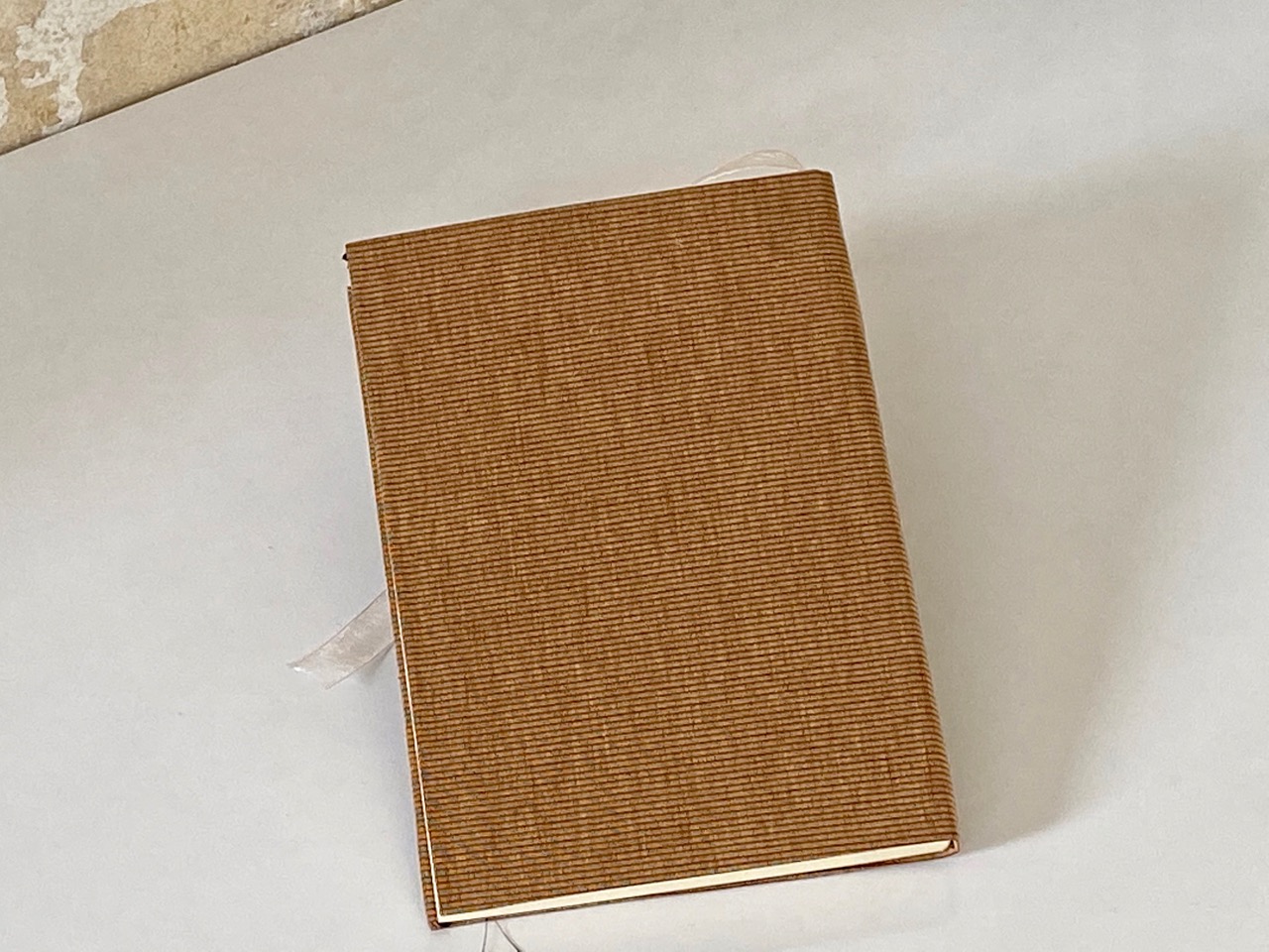 מחברת חלקה עטופה בבד בצבע אוקר עם פסים עדינים באדום